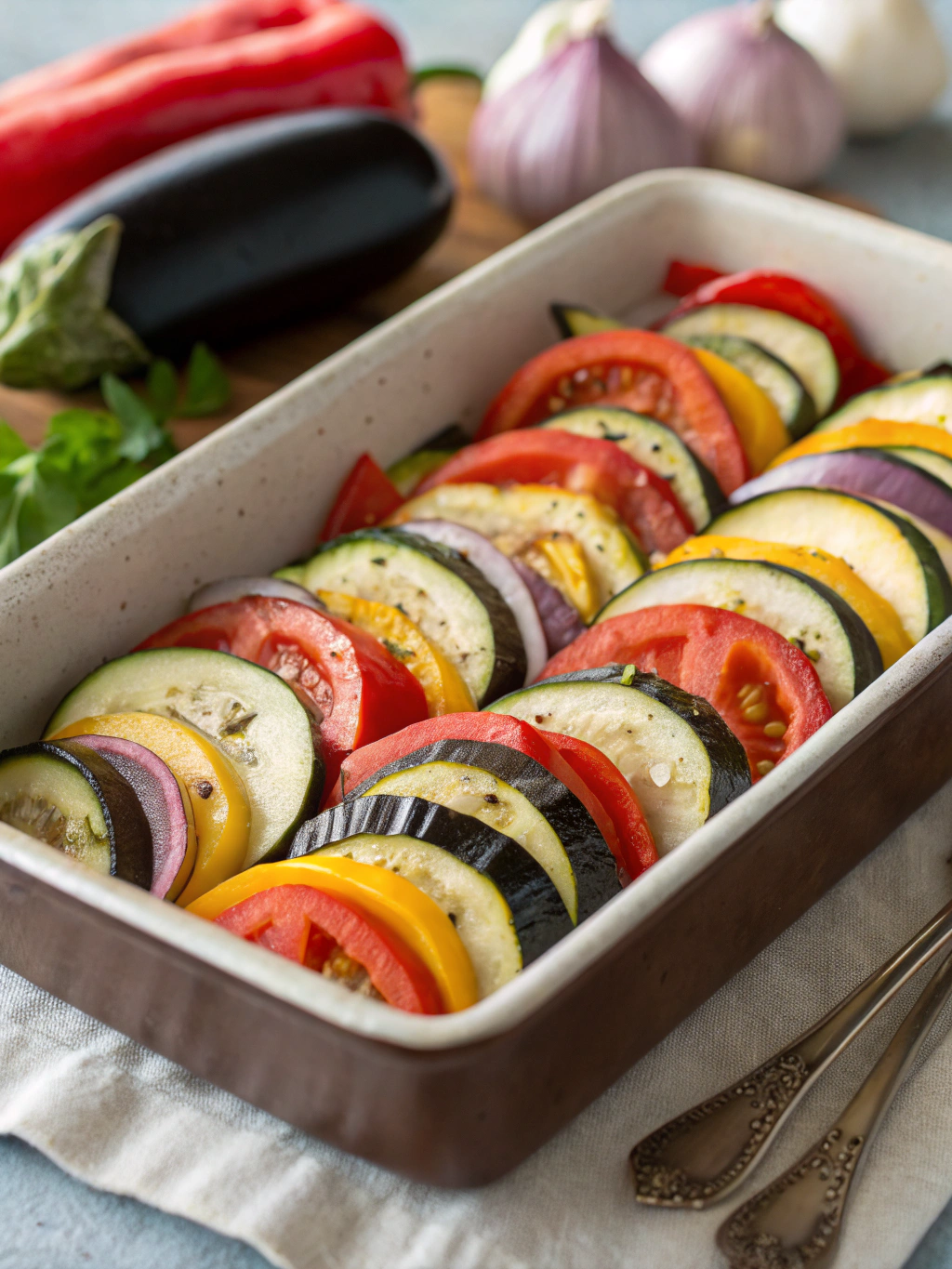 Enfournez à 180°C pendant 45 à 50 minutes. À mi-cuisson, pressez délicatement les légumes avec le dos d’une spatule pour qu’ils absorbent les jus qui se sont formés au fond du plat. Votre cuisine commencera à se remplir d’effluves méditerranéens – un signe que la magie opère !